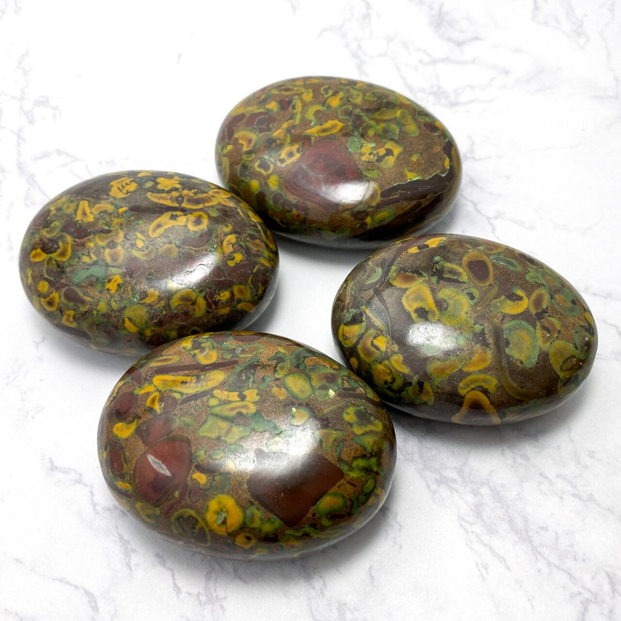 黄、緑、赤の模様の割合で、雰囲気も変わる面白いストーンです。