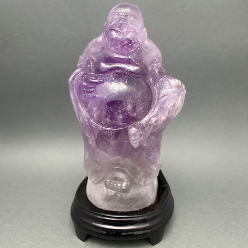 天然石彫刻置物 アメジスト 踊り布袋 台座付き
