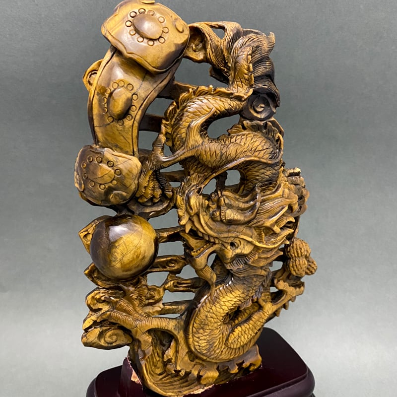 イエローとブラウンが混ざり合う独特の模様が美しく、細やかで迫力のある龍の彫刻によって、力強さを感じる逸品です。